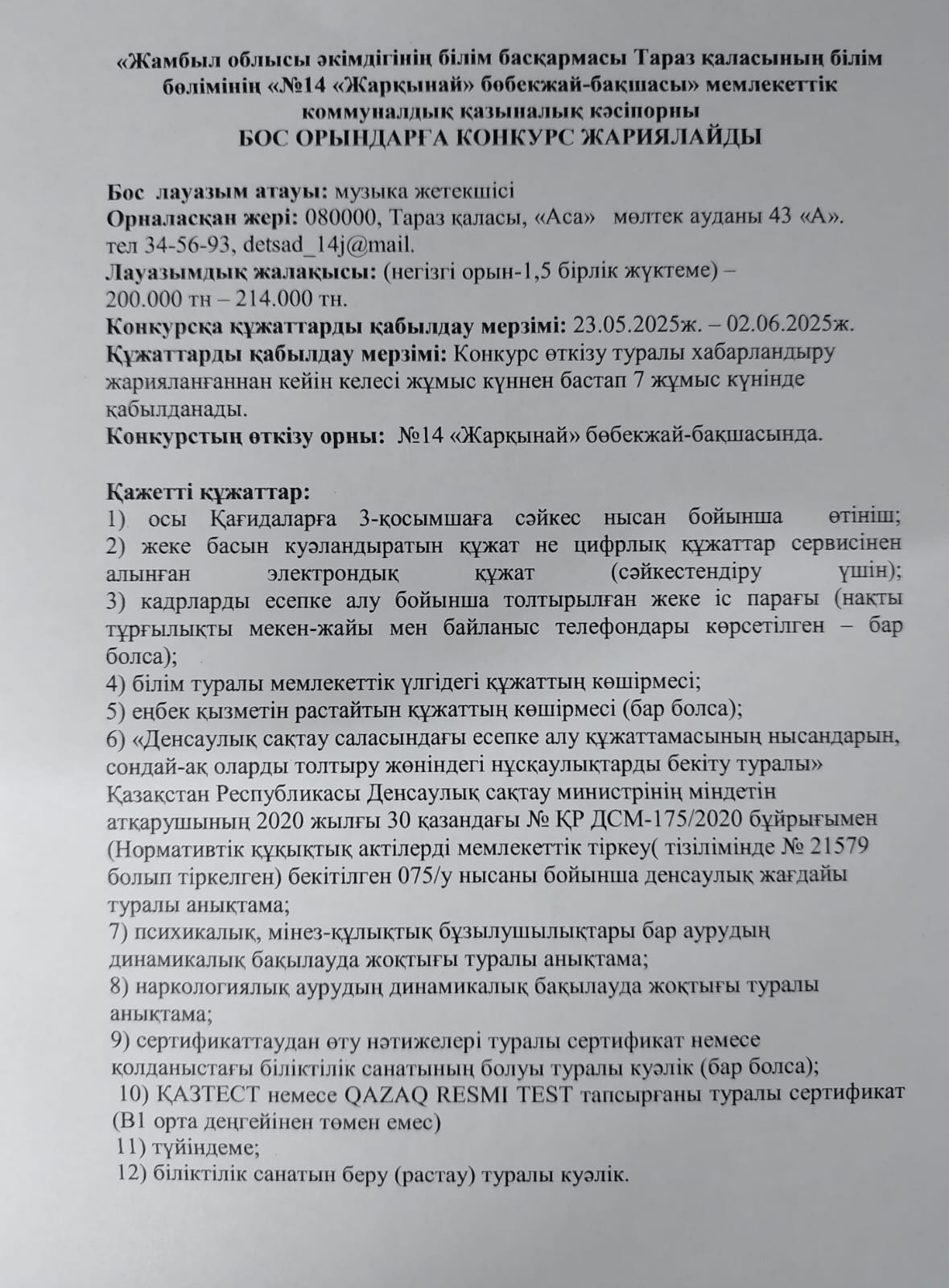 Бос орынға музыка жетекші лауазымына конкурс жариялау » №14 «Жарқынай» бөбекжай-бақшасы»
