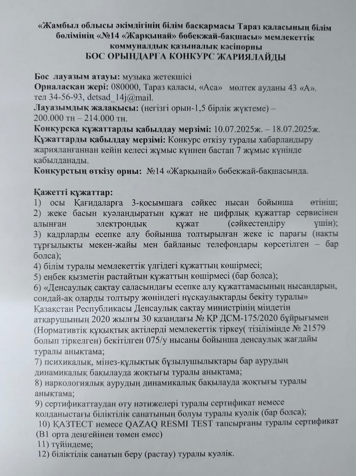 Бос орынға музыка жетекші лауазымына конкурс жариялау » №14 «Жарқынай» бөбекжай-бақшасы»