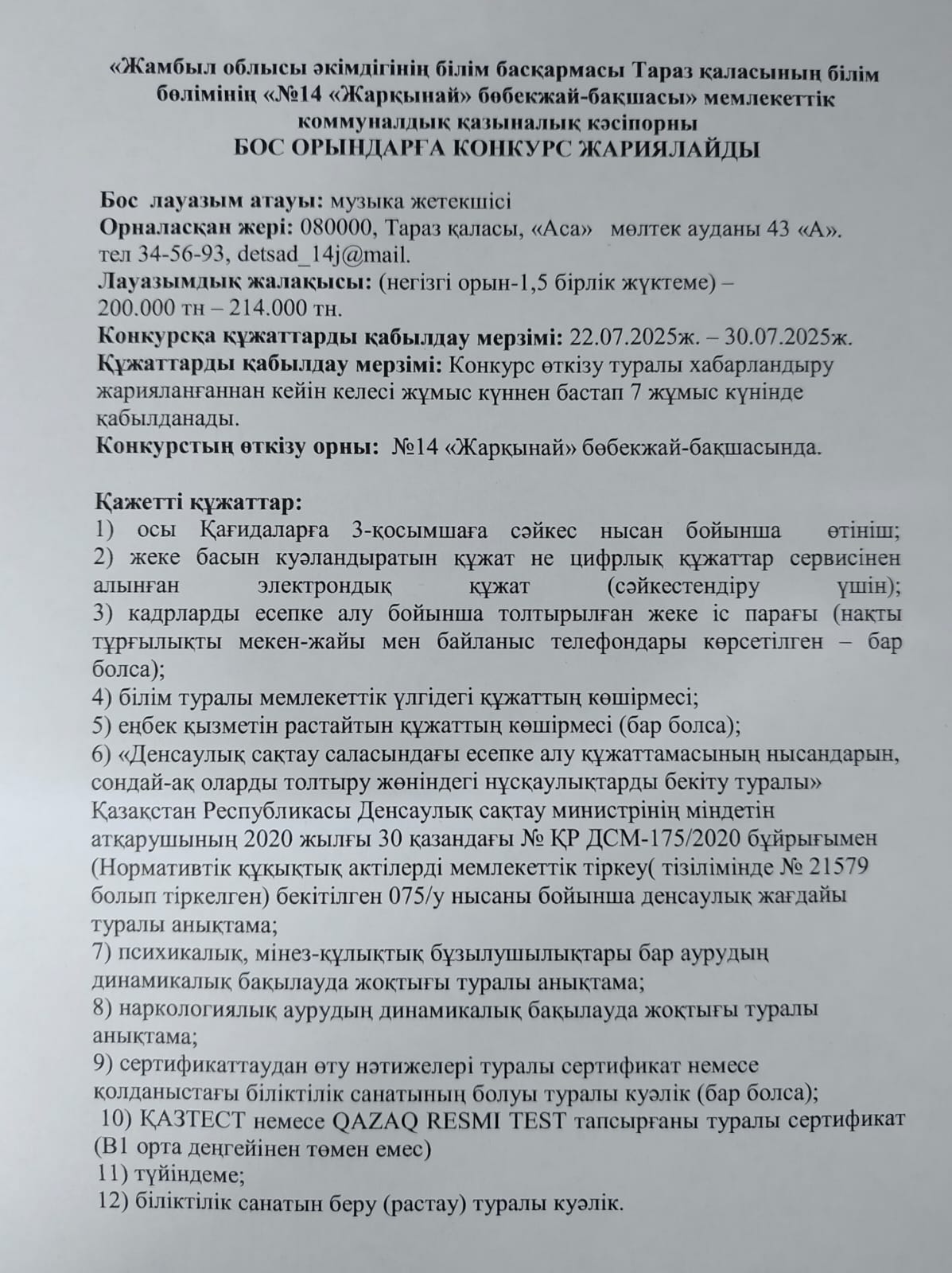 Бос орынға музыка жетекші лауазымына конкурс жариялау » №14 «Жарқынай» бөбекжай-бақшасы»