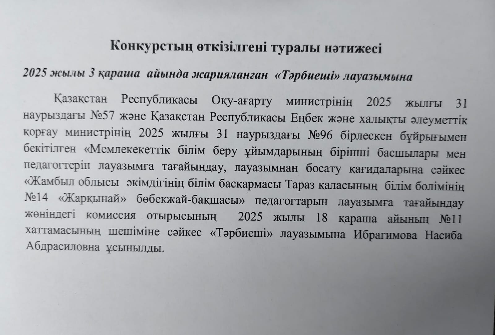 Конкурстың өткізілгені туралы нәтижесі » №14 «Жарқынай» бөбекжай-бақшасы»