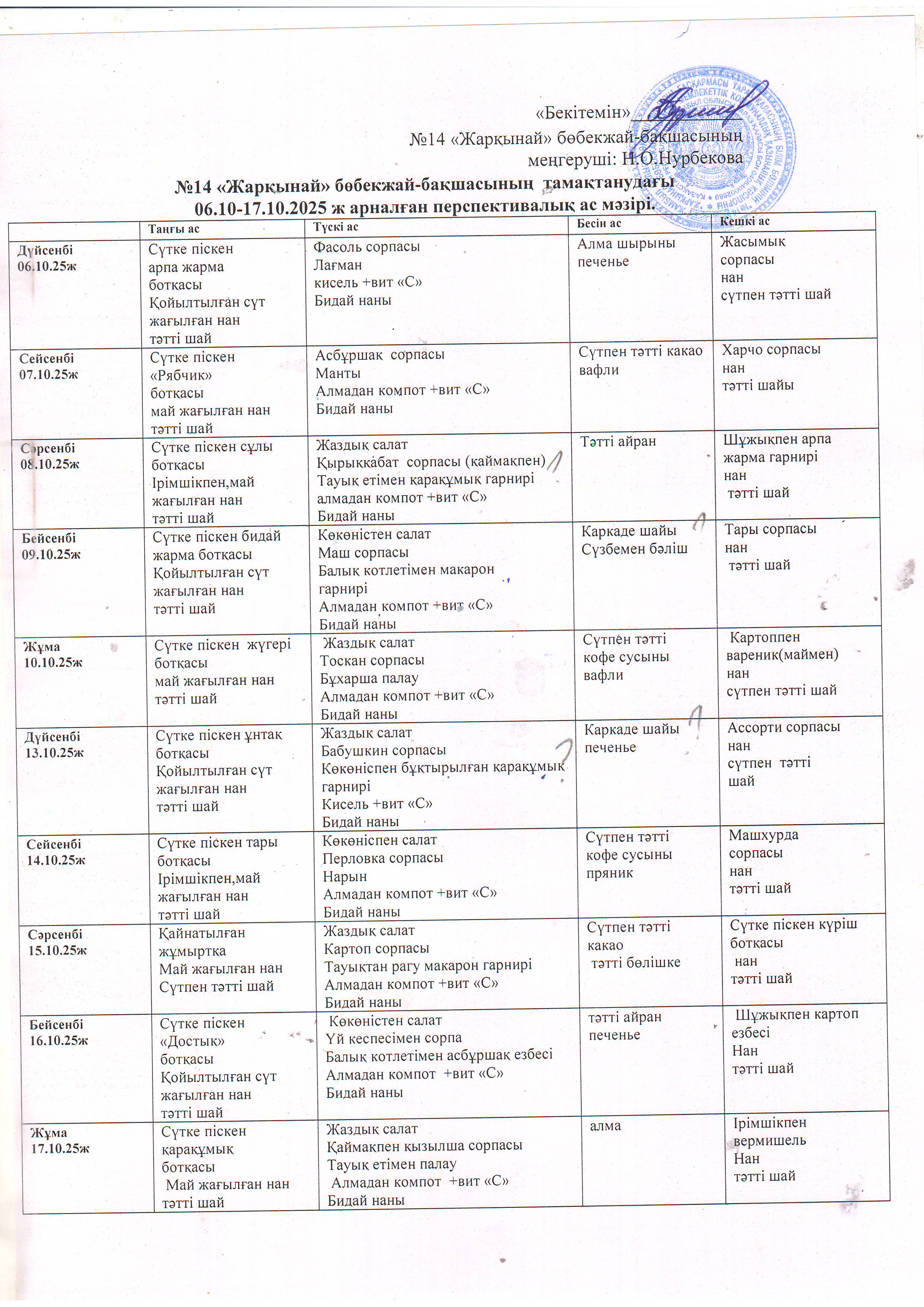 Перспективалык ас мәзірі (06.10.2025-17.10.2025) » №14 «Жарқынай» бөбекжай-бақшасы»