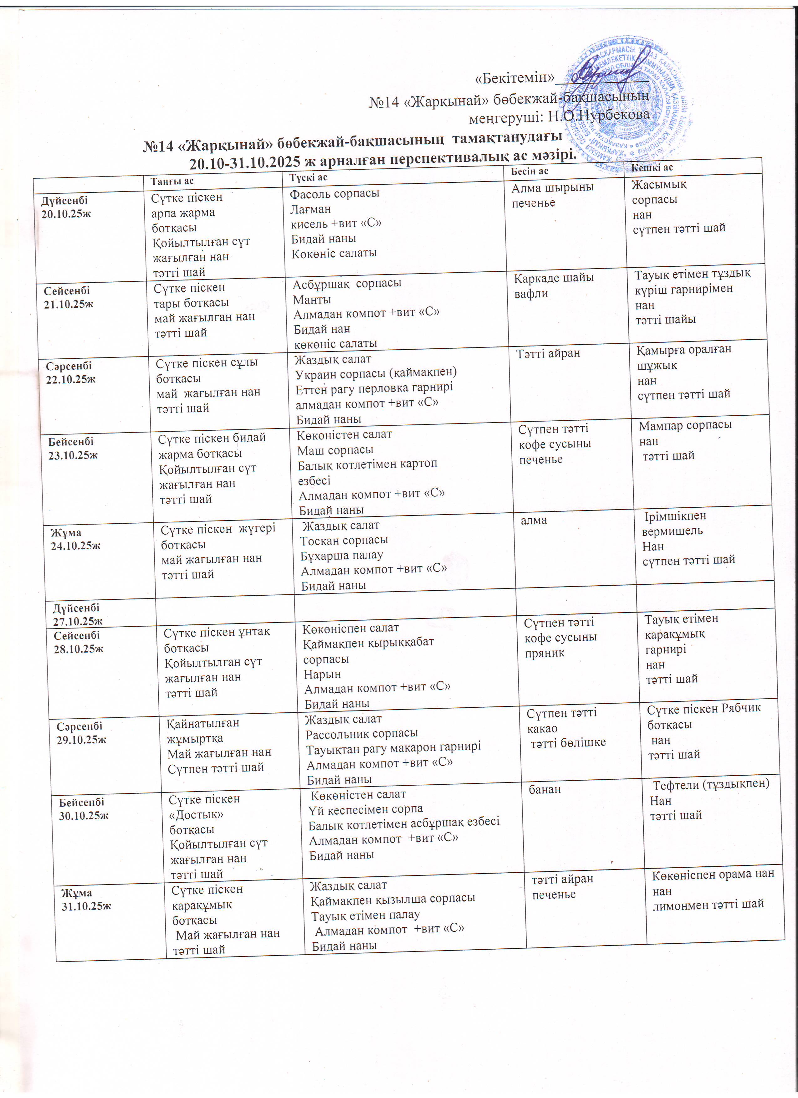 Перспективалық ас мәзірі (20.10.2025-31.10.2025) » №14 «Жарқынай» бөбекжай-бақшасы»